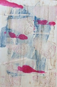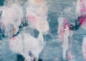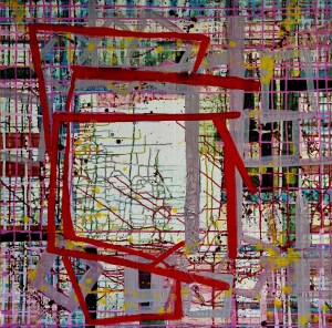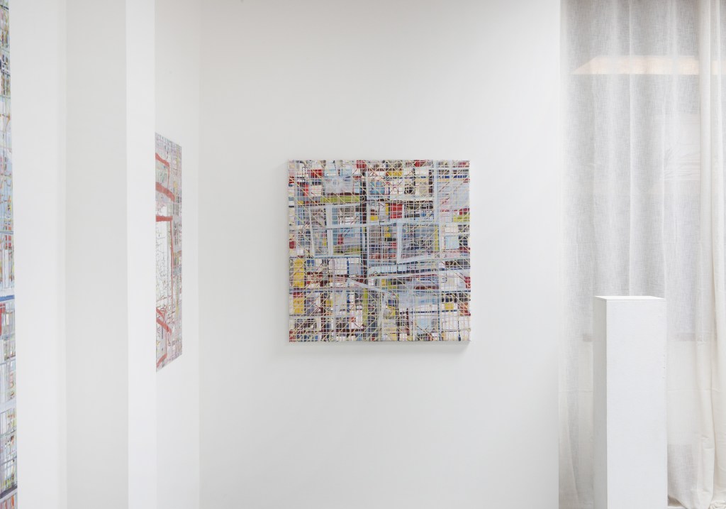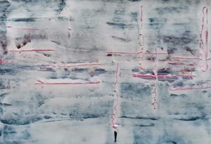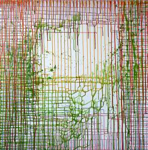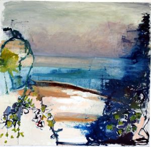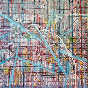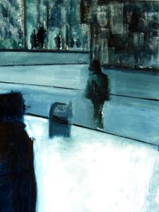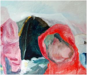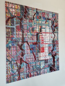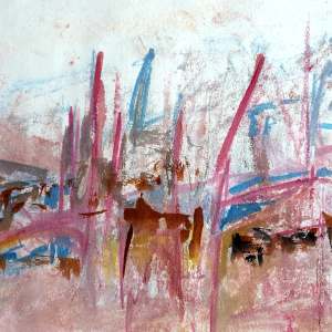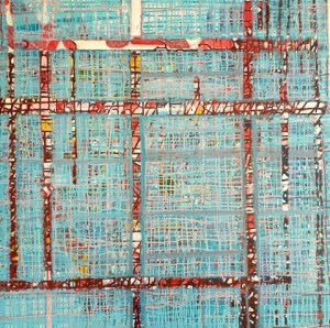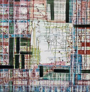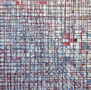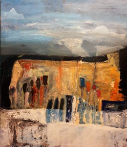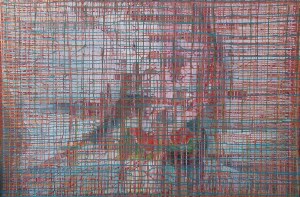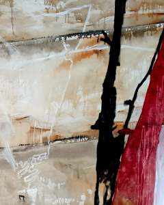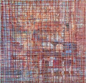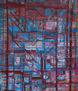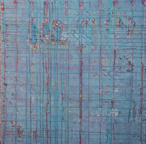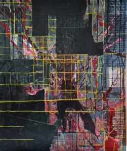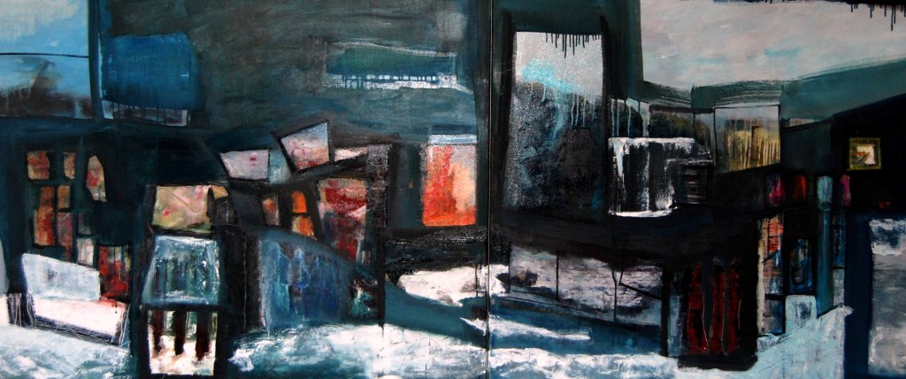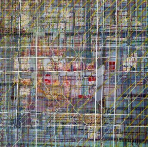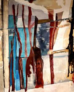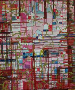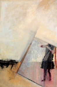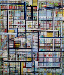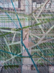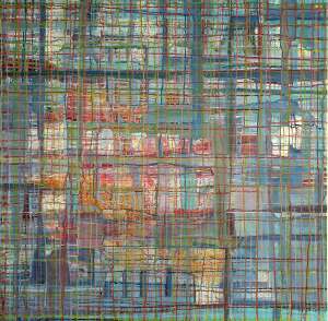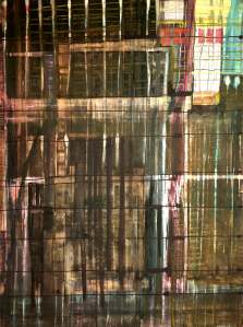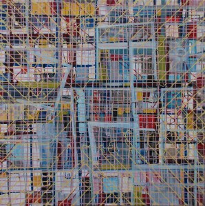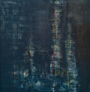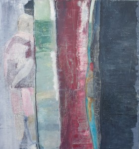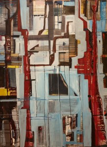 “Enigmatisch werk dat zijn geheimen met mondjesmaat prijs geeft. Het is fragmentair met architecturale blik. Je kijkt vanop een afstand wat een zekere mysterie aan het werk geeft. Toch lijkt het herkenbaar in zijn vorm. Een hele sterke compositie die zeker niet vanzelfsprekend is. Het kleurgebruik en de gelaagdheid valt op. Het formaat is uitdagend.”